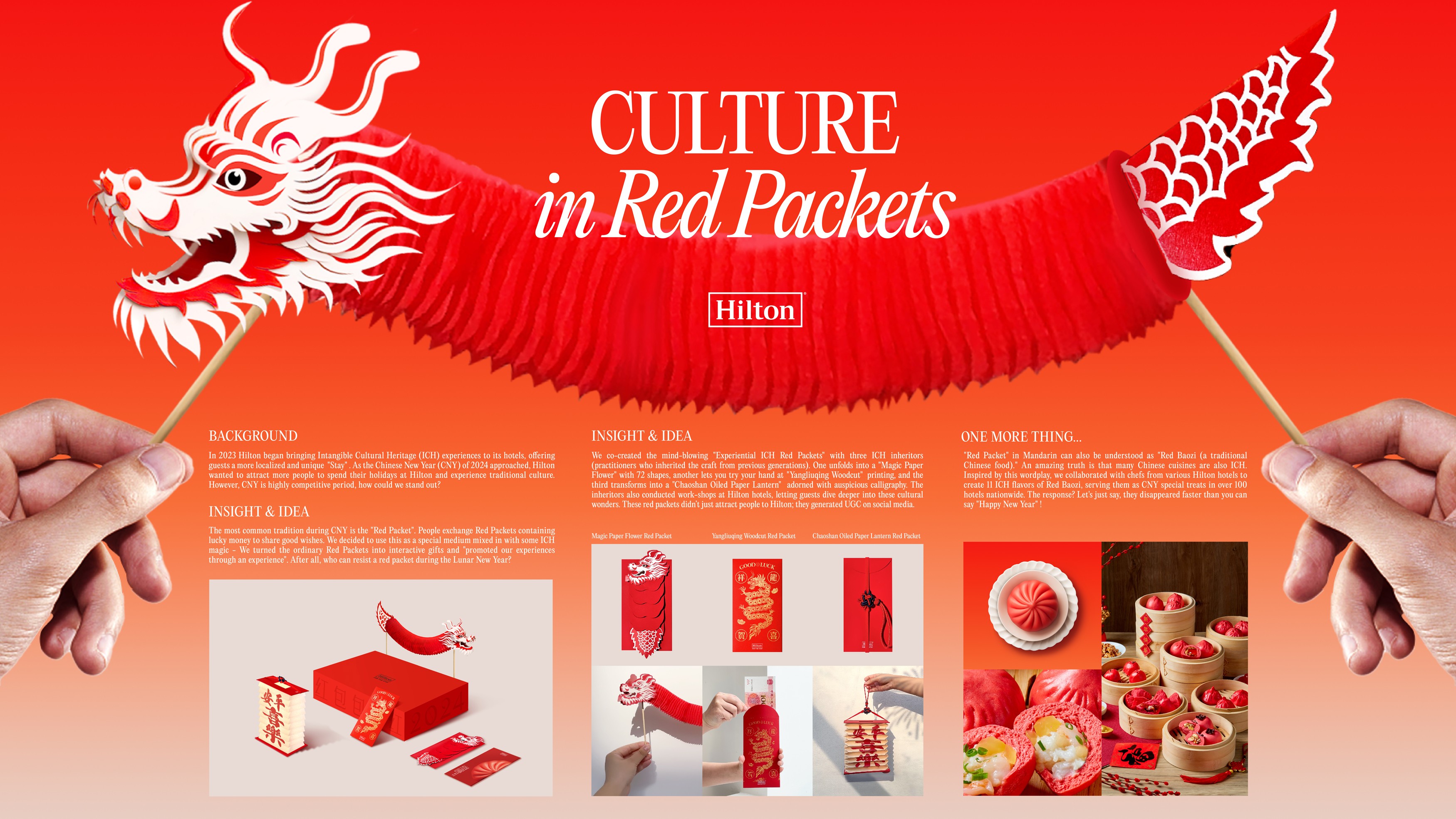 In 2023, Hilton transformed traditional Chinese New Year red packets into interactive cultural experiences, crafted by Intangible Cultural Heritage masters, creating unique, shareable stays that captivated and drew guests.